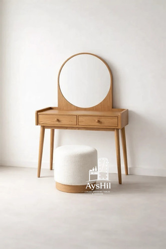 میز آرایش مدرن مدل لامیا؛ شاهکاری با روکش چوب طبیعی با آینه گرد ۷۰ سانت و قابلیت تغییر چیدمان (برند آیشیل)