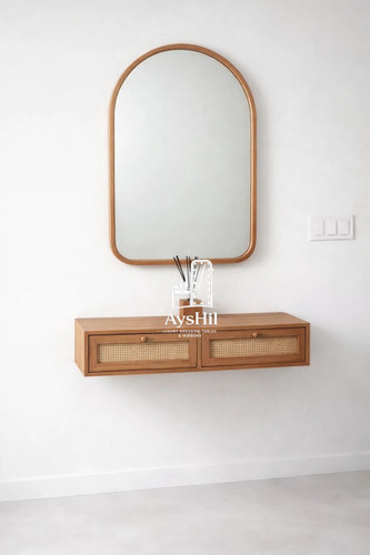 میز آرایش دیواری مدل ونسا - لوکس چوب راش طبیعی با آینه گرد، سفارشی‌سازی ابعاد و رنگ، کم‌جا و مدرن