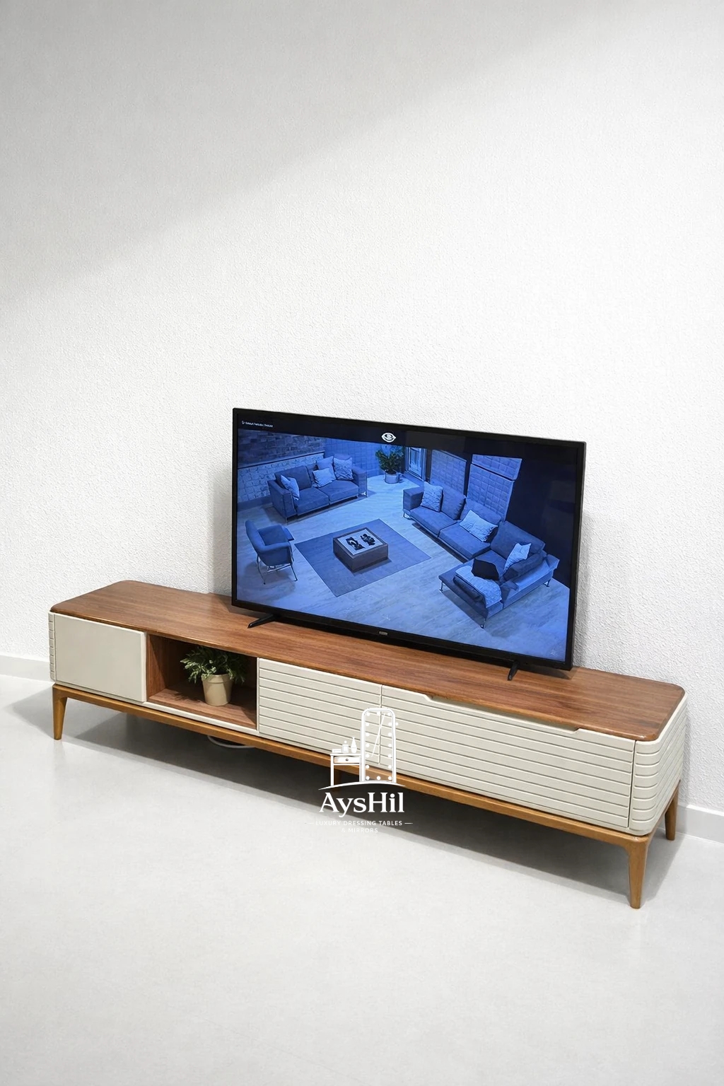 خرید میز تلویزیون چوبی مدل هیلدا ۱۸۰ سانتی | میز تلویزیون مدرن با روکش طبیعی راش، بلوط و گردو با قابلیت سفارشی سازی