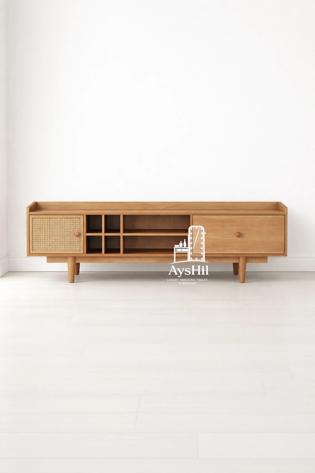 خریدمیز تلویزیون چوبی مدل هامون | میز TV لوکس با روکش طبیعی راش، بلوط و گردو + حصیر بامبو دست‌ساز و قابلیت سفارشی‌سازی