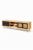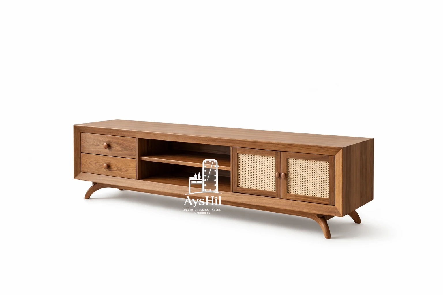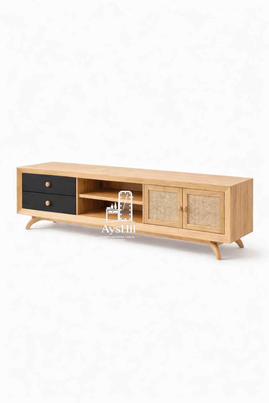 در کنار آن، استفاده از **حصیر بامبو طبیعی چوبی (غیرپلاستیکی)** جلوهای خاص و متفاوت ایجاد کرده که آوین را به یک عنصر دکوراتیو شاخص تبدیل میکند، نه صرفاً یک میز TV ساده.