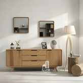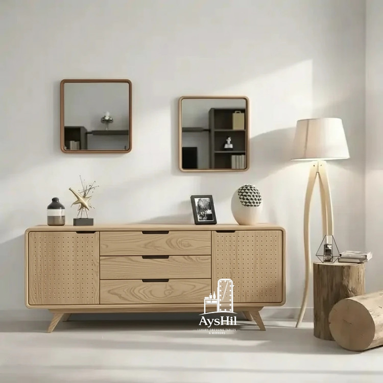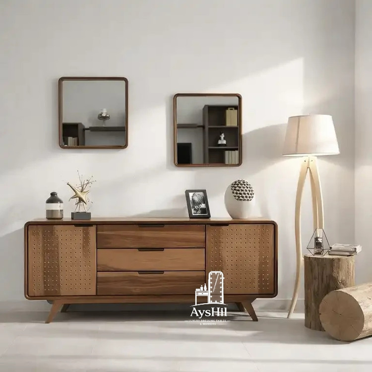 آینه کنسول چوبی مدل پینار با روکش طبیعی راش، بلوط و گردو | کنسول مدرن ۱۸۰ سانتی لوکس با درب ریلی