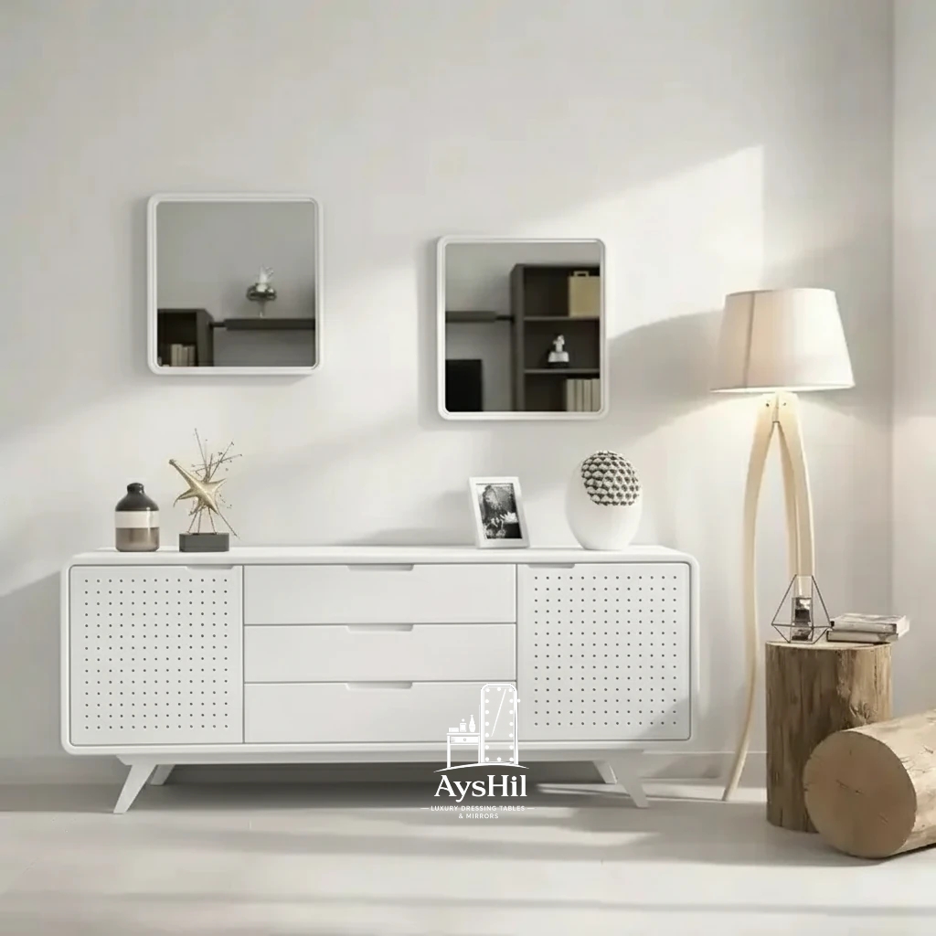 یکی از مهمترین ویژگیهایی که باعث محبوبیت **آینه کنسول مدرن مدل پینار** شده، طراحی ساده اما بسیار شیک آن است. وجود **دو آینه مربع ۶۰×۶۰ سانتیمتری** در کنار کنسول، ترکیبی متقارن و جذاب ایجاد میکند که جلوهای خاص به دیوار پذیرایی میدهد. این طراحی باعث میشود فضا روشنتر دیده شود و دکوراسیون منزل حالتی لوکس و حرفهای پیدا کند.