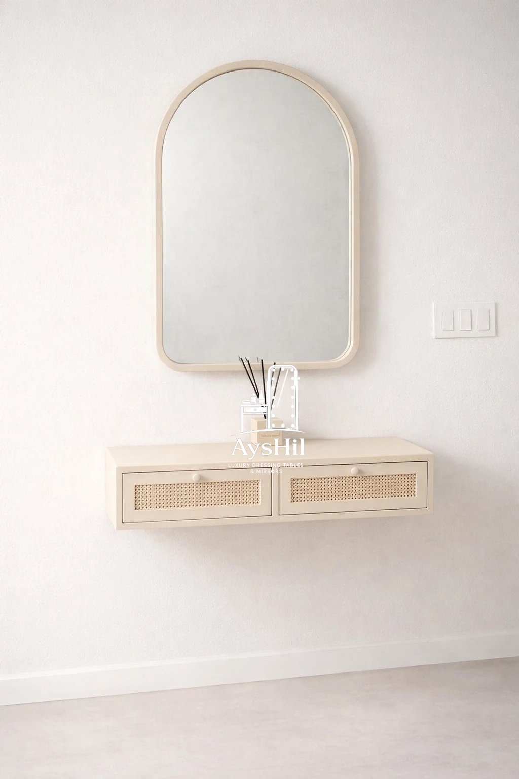 یکی از دغدغههای خریداران هنگام خرید میز آرایش دیواری با آینه، نحوه نصب آن است. در مدل والرین این موضوع به خوبی در نظر گرفته شده و با استفاده از سیستم فیتینگ، نصب میز بسیار آسان و سریع انجام میشود.