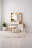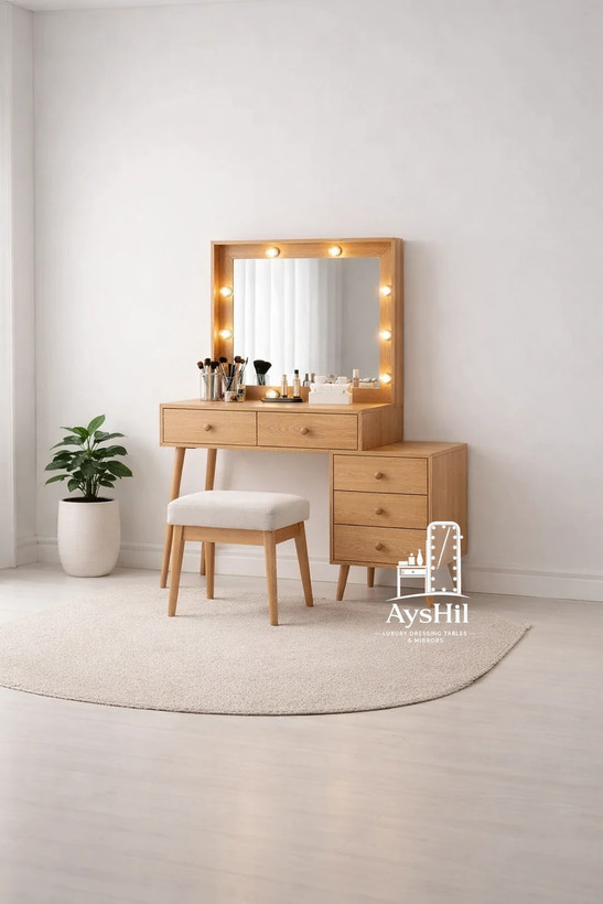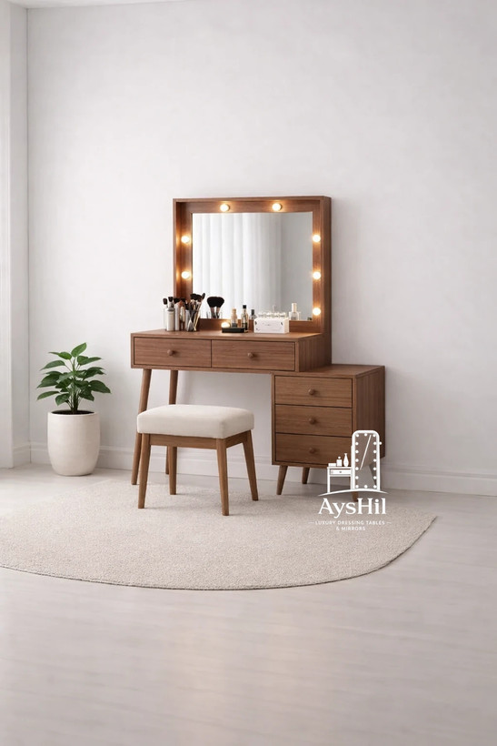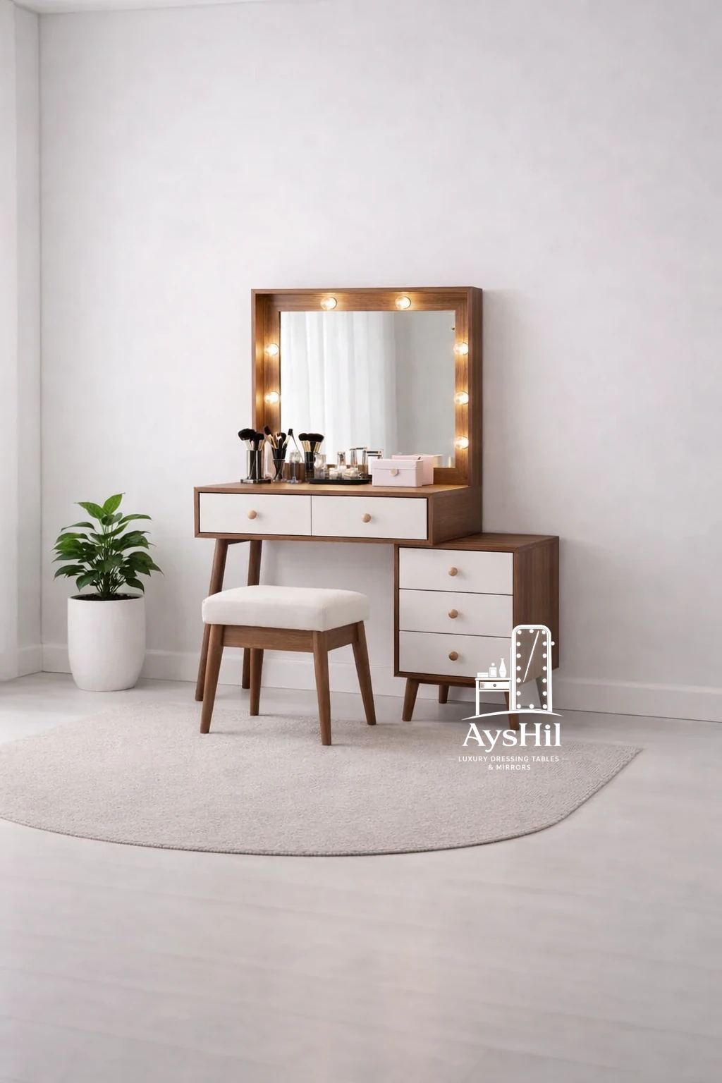 خرید میز آرایش مدرن مدل پاریس با آینه چراغ دار، ۵ کشو جادار و صندلی | میز آرایش چوبی لوکس