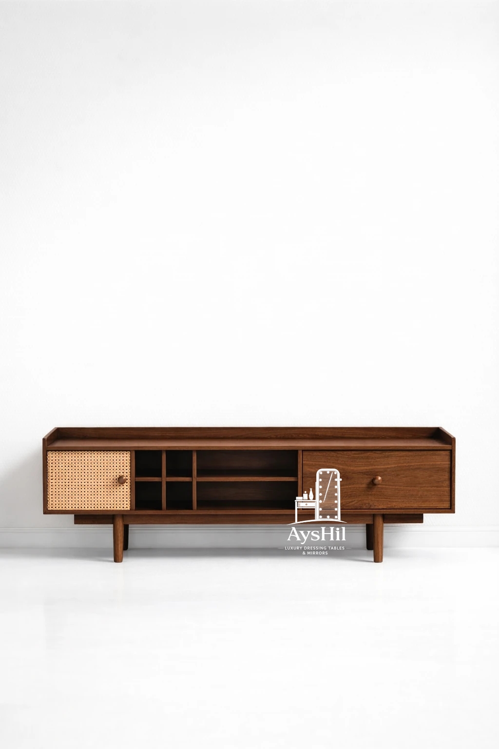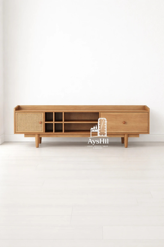 خرید میز تلویزیون چوبی لوکس مدل فلورانس ۱۸۰ سانتی | میز TV مدرن با روکش طبیعی راش، بلوط و گردو + حصیر بامبو
