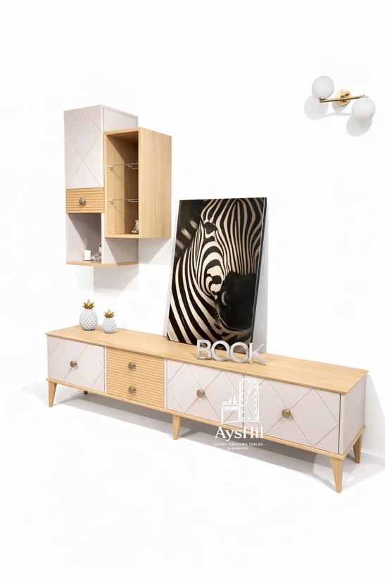 ابعاد استاندارد **۱۸۰ سانتیمتری** این محصول باعث شده برای اکثر تلویزیونهای امروزی کاملاً مناسب باشد. البته یکی از مزیتهای مهم این مدل، امکان **ساخت در ابعاد سفارشی ۱۶۰ و ۲۲۰ سانتیمتر** است. این ویژگی باعث میشود افرادی که به دنبال **میز تلویزیون سفارشی متناسب با فضای خانه** هستند نیز بتوانند از این مدل استفاده کنند.