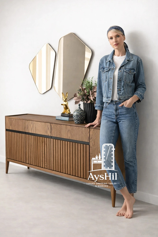 این کنسول با بدنهی مقاوم **MDF روکش طبیعی راش، بلوط و گردو** حس گرما و طبیعت چوب را به فضا میآورد، در حالیکه ظاهر مدرن و خطوط شکیل آن، برای هر سبک دکوراسیون (مدرن تا کلاسیک) مناسب است.
