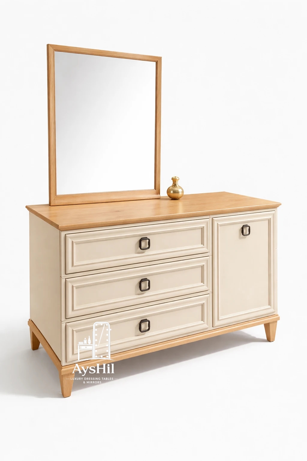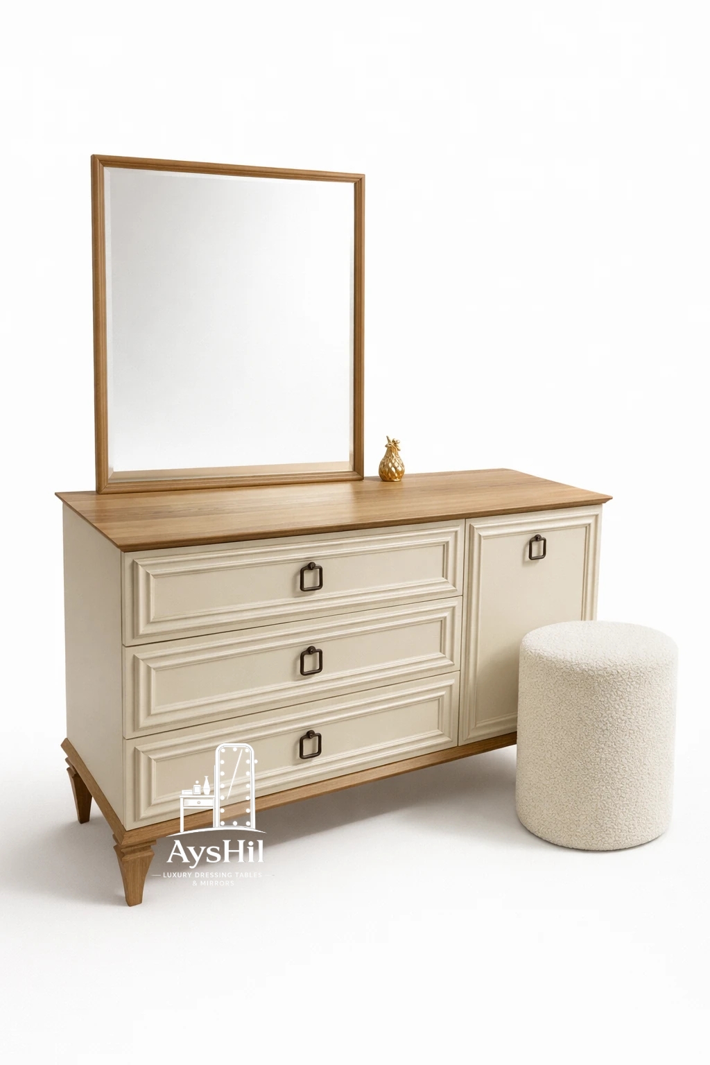 پایههای این میز از **چوب نراد طبیعی ضد موریانه** ساخته شده که علاوه بر استحکام بالا، طول عمر محصول را به شکل قابل توجهی افزایش میدهد. همچنین استفاده از **یراقآلات استاندارد و دستگیرههای فلزی مقاوم** در ساخت این میز آرایش، کیفیت و دوام آن را در استفاده طولانیمدت تضمین میکند.