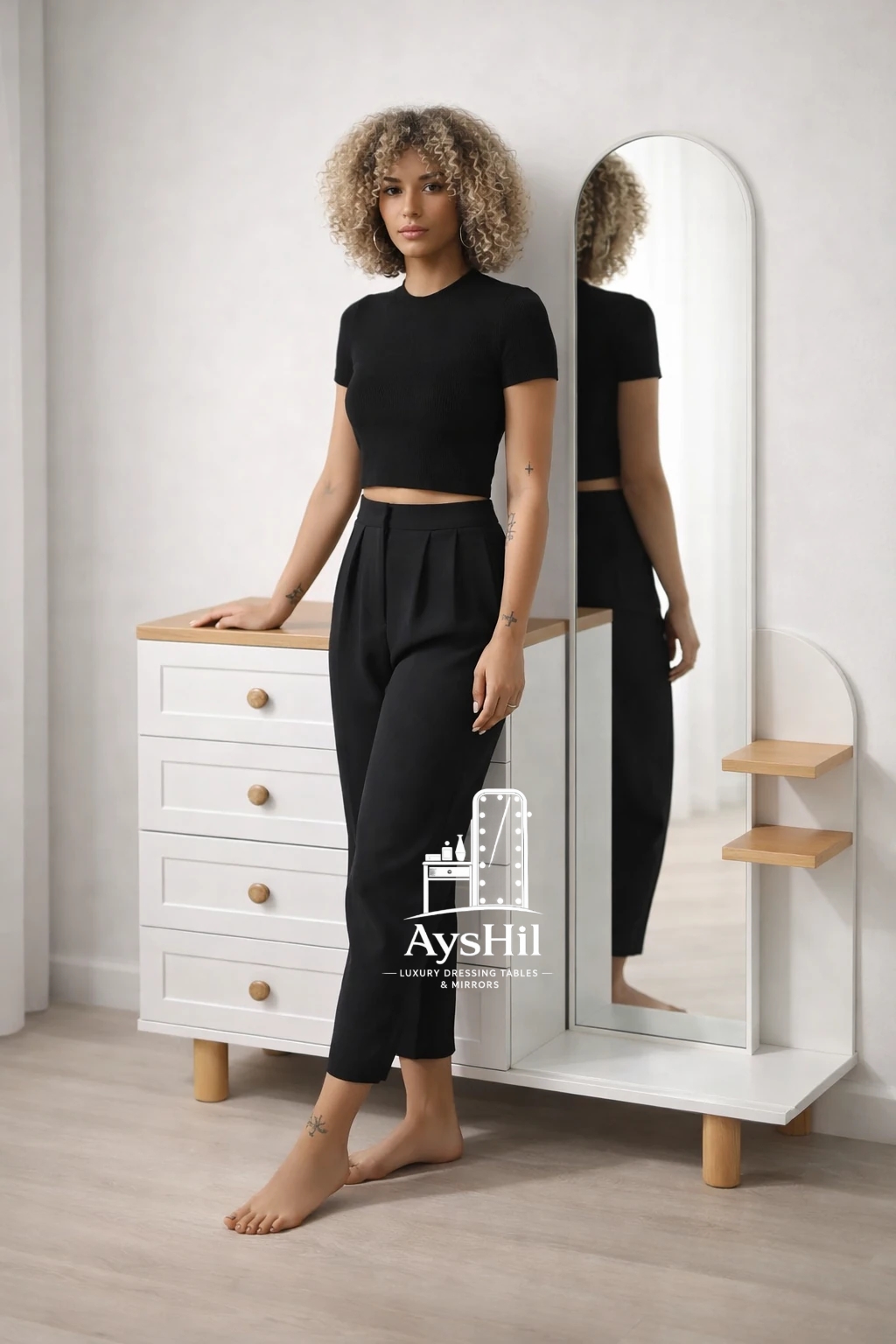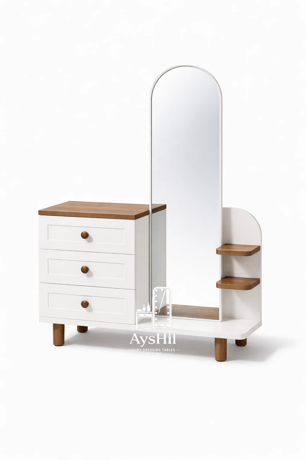 **آینه قدی تمامقد** با وضوح بالا، هم کاربردی است و هم فضا را بزرگتر نشان میدهد. همین ترکیب باعث شده این میز برای **اتاق خوابهای مدرن یا جهیزیه عروس** گزینهای بیرقیب باشد.