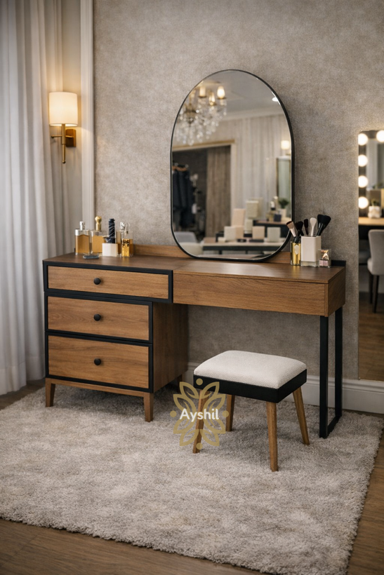 🔸این میز آرایش مدرن با ترکیب چوب روشن و مشکی، انتخابی ایدهآل برای افرادیست که به طراحی مینیمال، شیک و امروزی اهمیت میدهند.