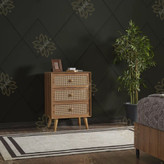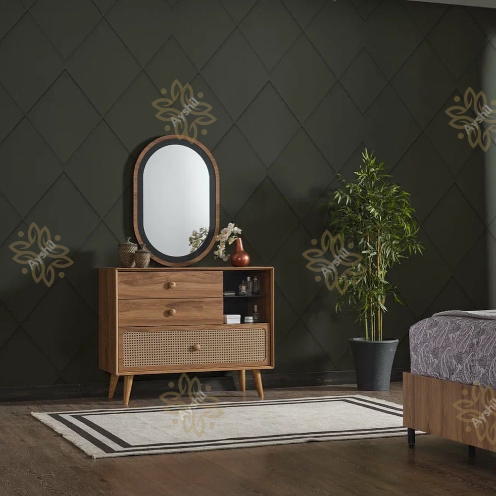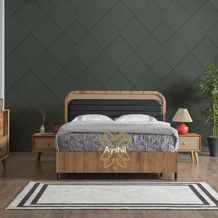تخت خواب مدرن چوبی با تاج حصیری و لمسه مشکی | خرید تخت خواب لاکچری