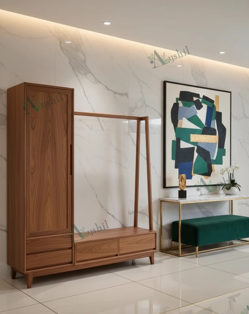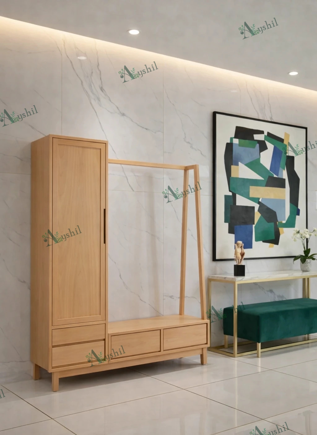 کایرا با طراحی مینیمال، خطوط صاف و تناسب دقیق اجزا، حس نظم و آرامش را به فضا القا میکند. ترکیب فضای آویز لباس، کمد بسته و کشوهای جادار در قسمت پایینی، این رگال را به انتخابی هوشمندانه برای اتاق خواب، کلوزتروم یا فضاهای مدرن تبدیل کرده است. ظاهر گرم چوب طبیعی، جلوهای شیک و ماندگار به دکوراسیون میبخشد.