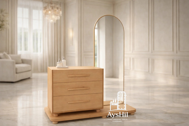 میز آرایش مدل لاویتا از چوب مرغوب و MDF با روکش طبیعی راش، ۳ کشوی جادار با ریل ساچمهای و آینه قدی با کیفیت گرید +A.