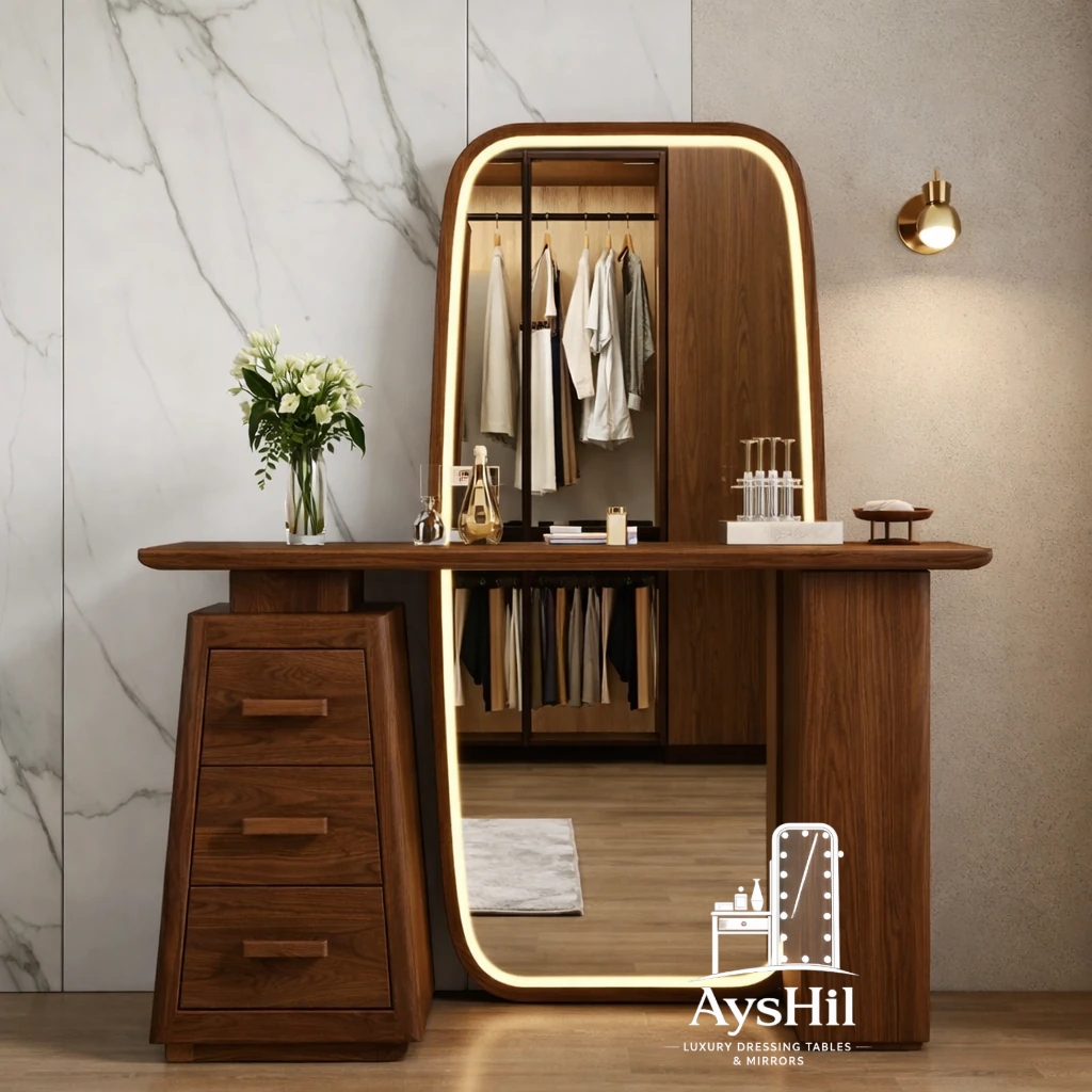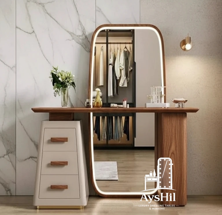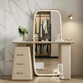 | **آینه با نورپردازی LED:** مهمترین ویژگی ظاهری، آینه بزرگ با فرم کپسولی و نورپردازی داخلی است که علاوه بر زیبایی، نور کافی و بدون سایه برای آرایش فراهم میکند؛ یک امتیاز بزرگ در طراحیهای امروزی. | **اشغال فضا توسط آینه:** فرم آینه، با اتصال به صفحه میز و امتداد تا کف، در عین زیبایی، ممکن است در حمل و نقل یا جابجاییهای مکرر نیاز به دقت بیشتری داشته باشد. |