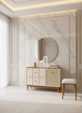 در نگاه اول، استفاده از روکش طبیعی چوب راش حس اصالت، گرما و لوکس بودن را منتقل میکند. ترکیب هوشمندانهی این روکش با حصیر بامبو چوبی در قسمتهایی از دربها، جلوهای مدرن و متفاوت ایجاد کرده که آن را از میز آرایشهای معمول بازار متمایز میسازد. این طراحی باعث میشود میز آرایش شقایق هم در دکوراسیونهای مدرن و هم کلاسیک بهراحتی هماهنگ شود.