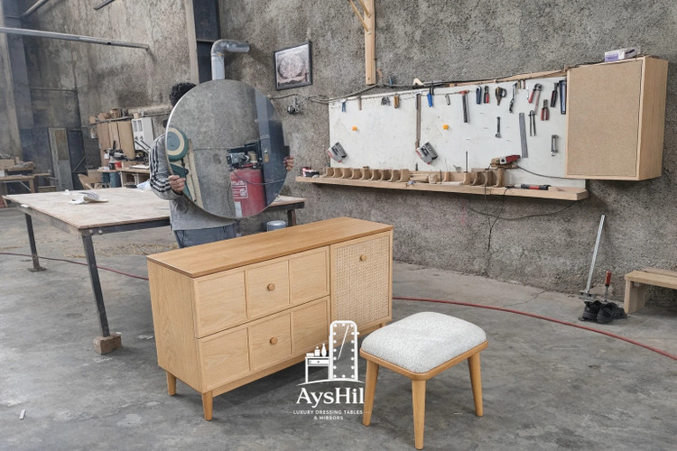 میز آرایش لوکس مدل شقایق ساخته شده از چوب مرغوب و MDF درجه یک با روکش طبیعی راش و حصیر بامبو چوبی. رنگبندی متنوع، ابعاد سفارشی و ارسال مطمئن. خرید مستقیم با کیفیت عالی.