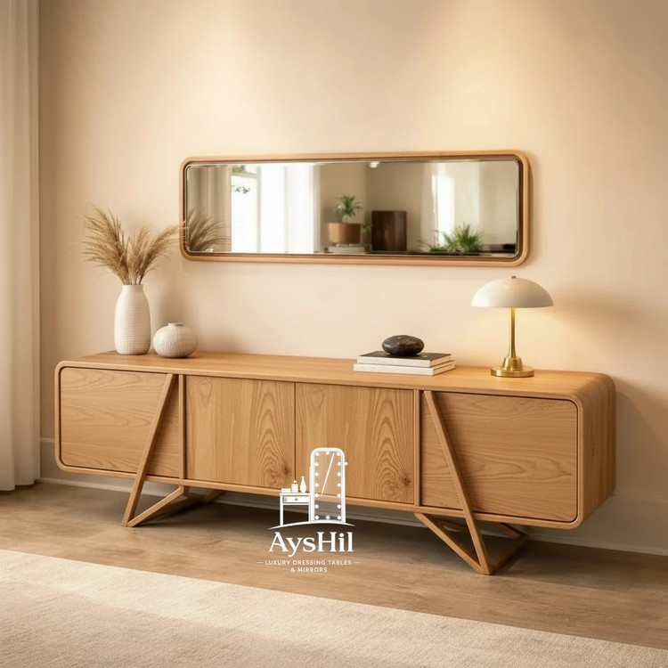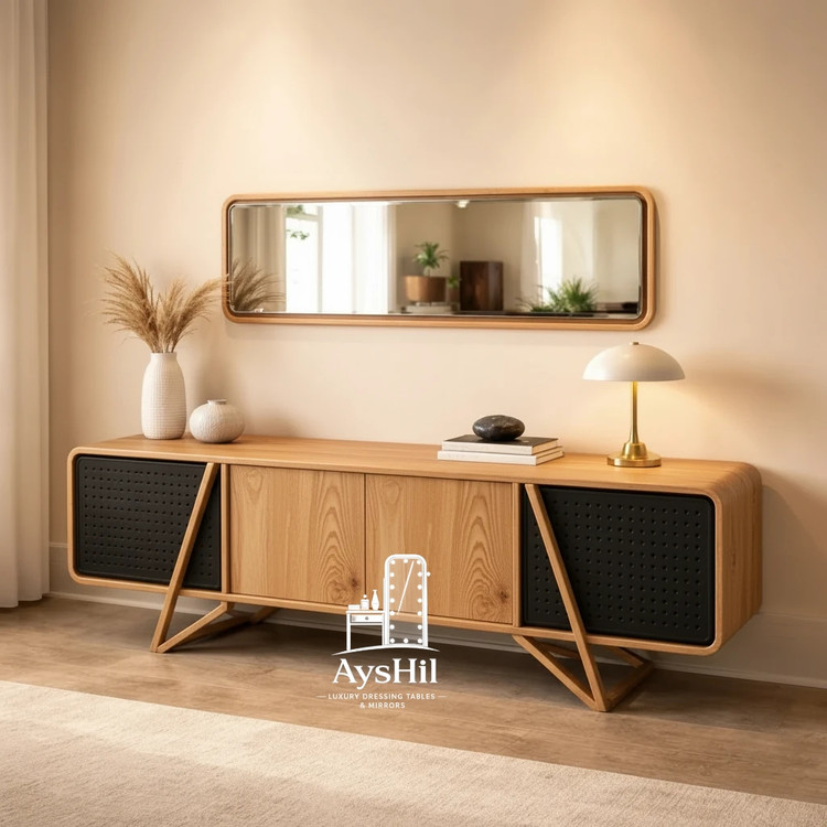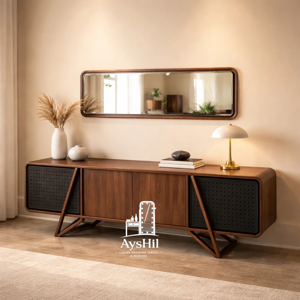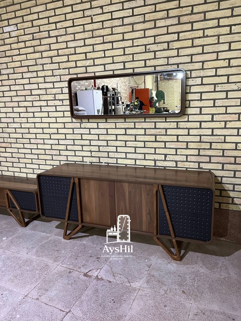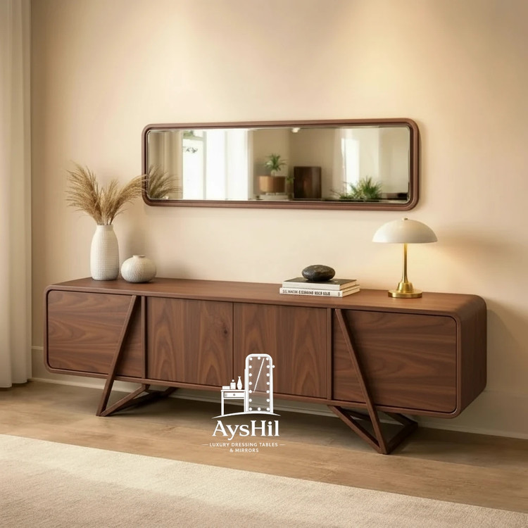 آینه کنسول چوبی لوکس مدل راینا | روکش طبیعی گردو و راش | ابعاد ۱۸۰ سانتی متر | کنسول مدرن سفارشی