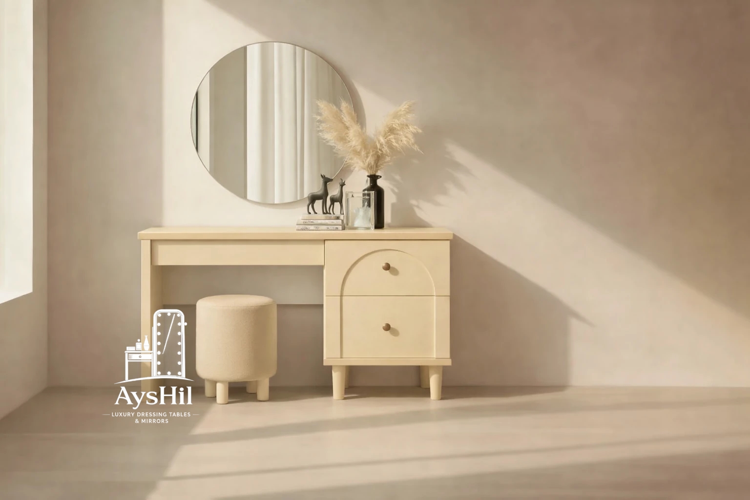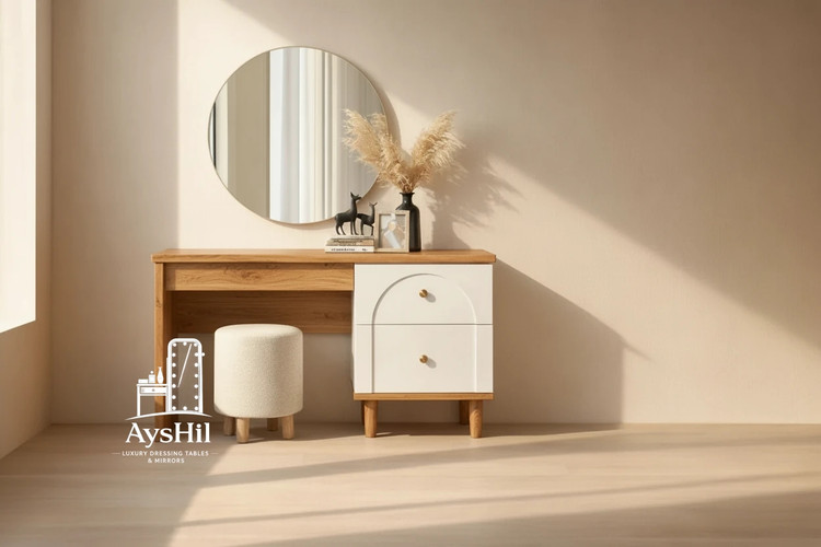 میز آرایش لاکچری تیانا | کشو مخفی مگنتی، روکش چوب راش، آینه گرد ۷۰ (خرید ویژه)