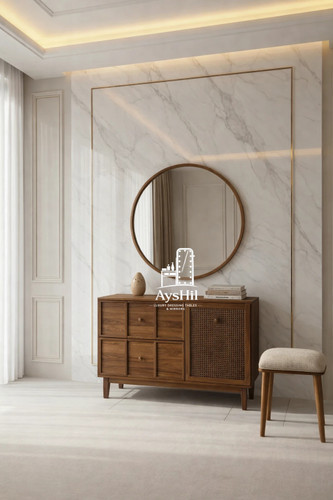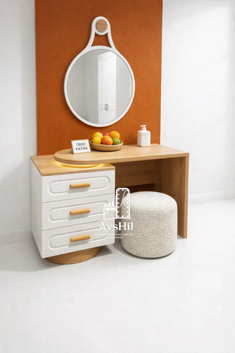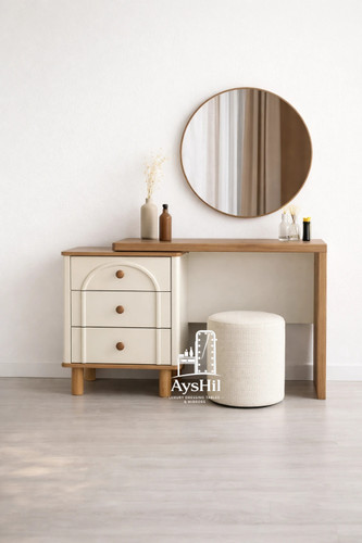 میز آرایش مدرن مدل لامیا؛ شاهکاری با روکش چوب طبیعی با آینه گرد ۷۰ سانت و قابلیت تغییر چیدمان (برند آیشیل)