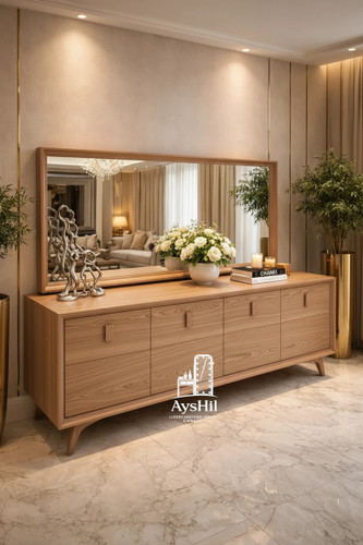 آینه کنسول چوبی لوکس مدل نارسیس | خرید آینه کنسول مدرن با ۴درب جادار و آینه دفرمه