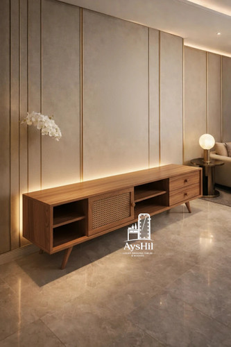 میز تلویزیون مدل سالونی لوکس | MDF با روکش طبیعی چوب راش | سفارشی در ابعاد ۱۸۰، ۲ و ۲.۵ متر