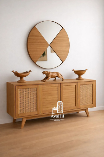 قیمت و خرید آینه کنسول چوبی مدرن و لاکچری مدل وینرال با حصیر بامبو و آینه گرد | روکش چوب طبیعی و سایز سفارشی