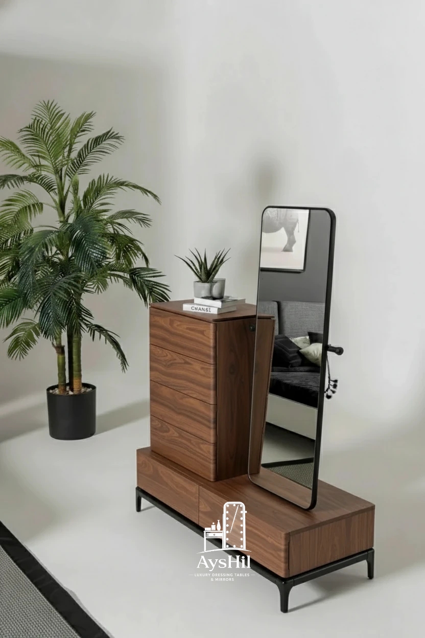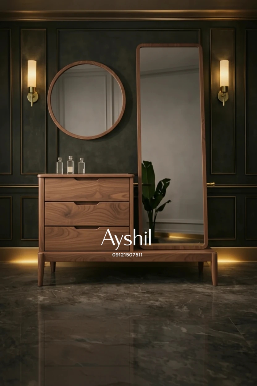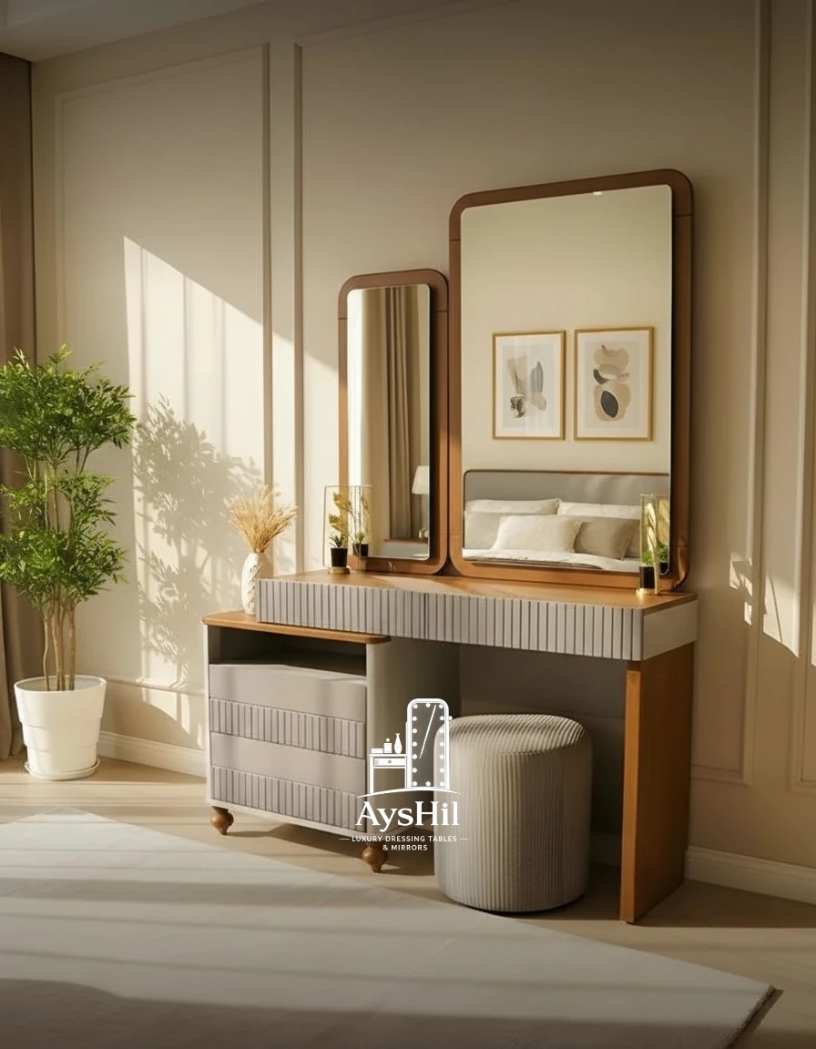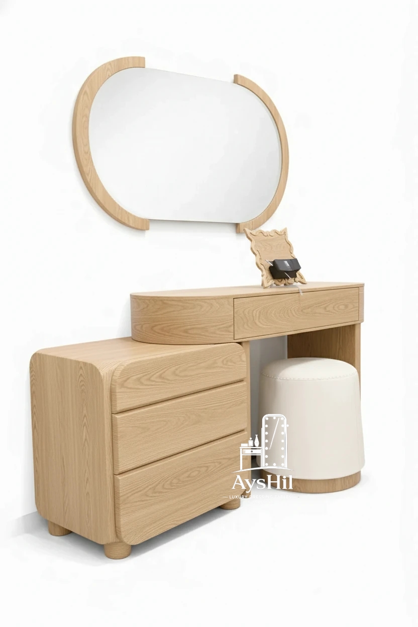میز آرایش مدل رئال | لوکس با روکش طبیعی چوب راش و آینه قدی و طراحی سفارشی در رنگ و ابعاد دلخواه،طراحی مدرن و کیفیت ماندگار