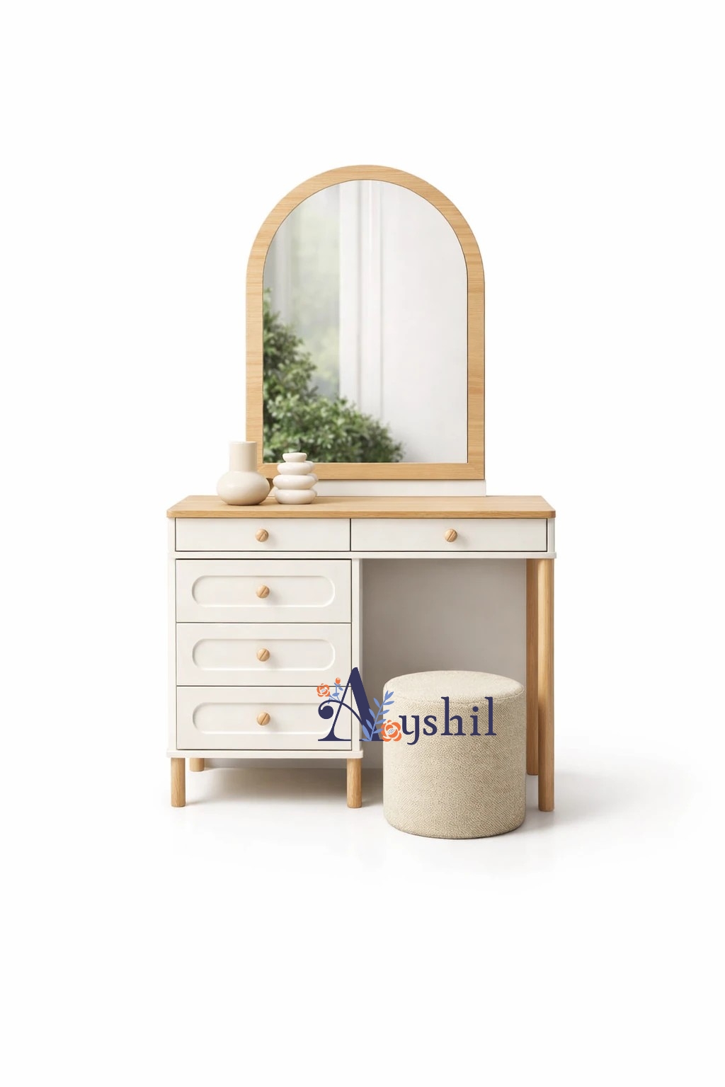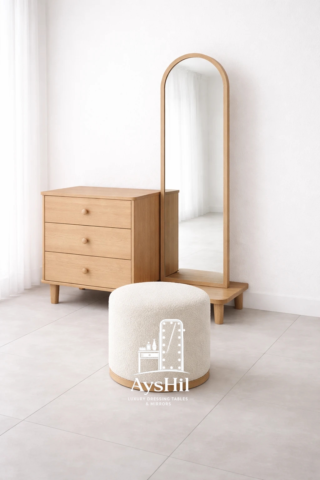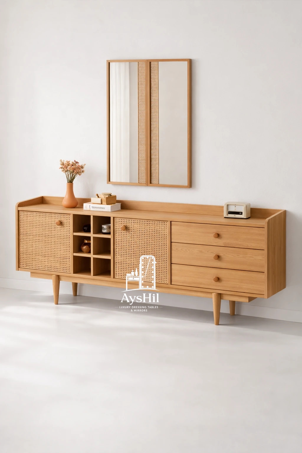 میز آرایش مدل رئال | لوکس با روکش طبیعی چوب راش و آینه قدی و طراحی سفارشی در رنگ و ابعاد دلخواه،طراحی مدرن و کیفیت ماندگار
