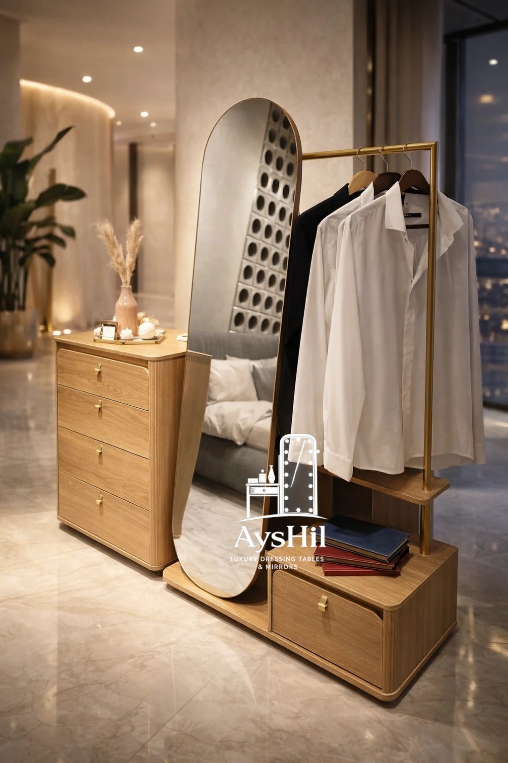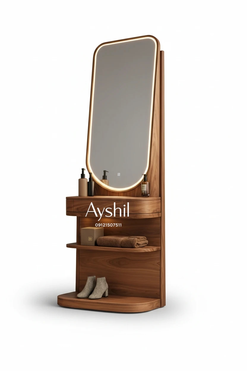 آینه قدی لوکس چوبی آیشیل مدل رُزالین | کشوی جادار پارتیشنبندی | روکش طبیعی راش