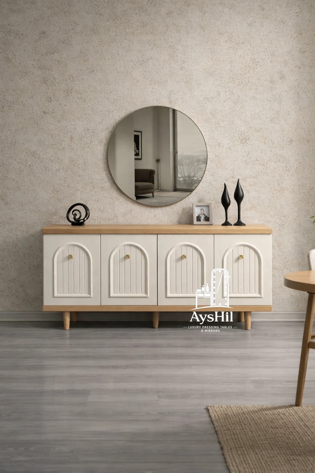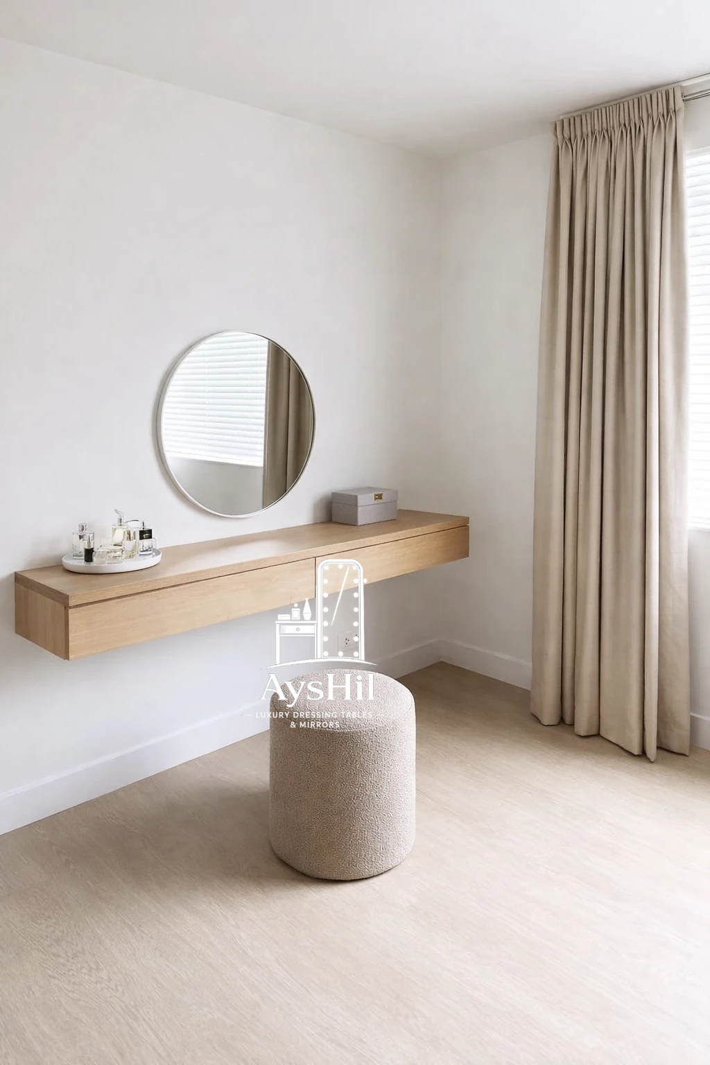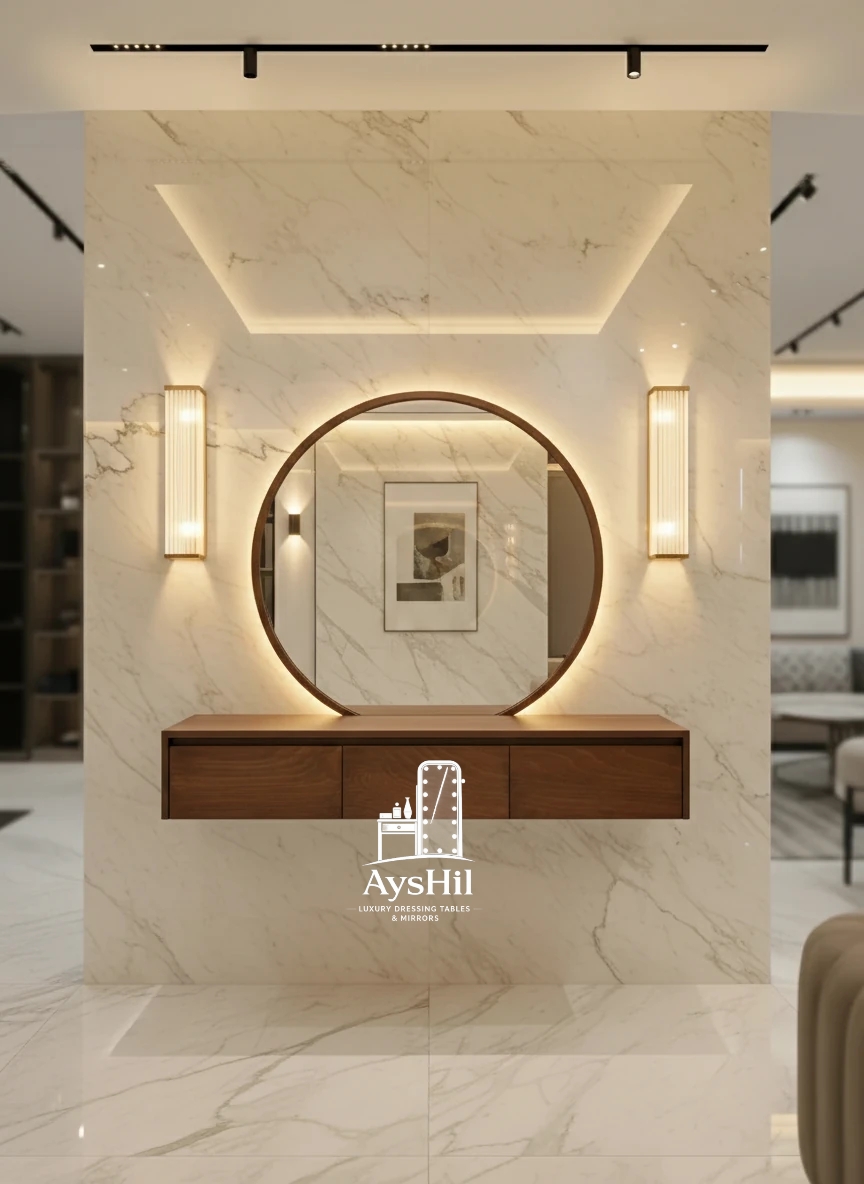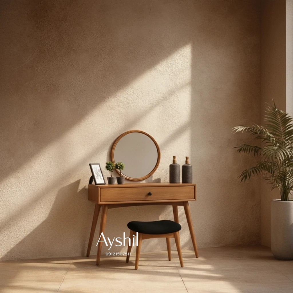 میز آرایش مدرن مدل لامیا؛ شاهکاری با روکش چوب طبیعی با آینه گرد ۷۰ سانت و قابلیت تغییر چیدمان (برند آیشیل)