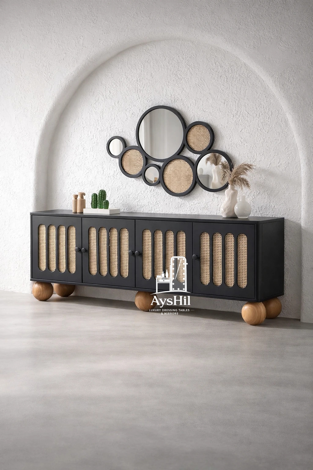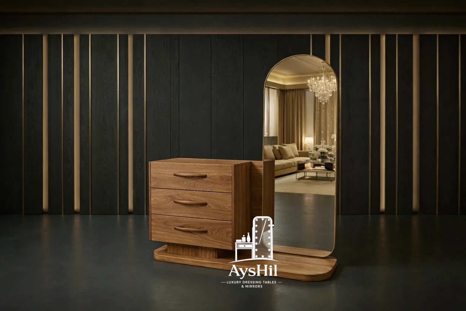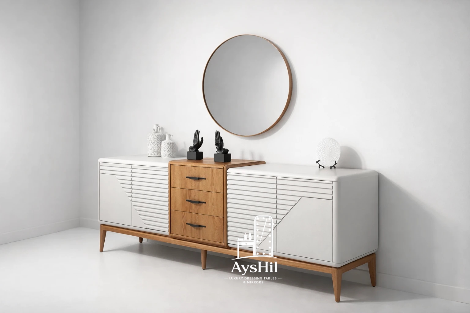 میز آرایش مدرن مدل لامیا؛ شاهکاری با روکش چوب طبیعی با آینه گرد ۷۰ سانت و قابلیت تغییر چیدمان (برند آیشیل)