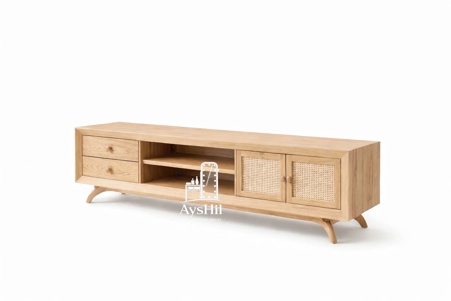 خرید میز تلویزیون دارای جلومبلی فلورانس لوکس MDF با روکش طبیعی چوب راش و بلوط | ابعاد ۱۸۰، ۲۰۰ و ۲۲۰