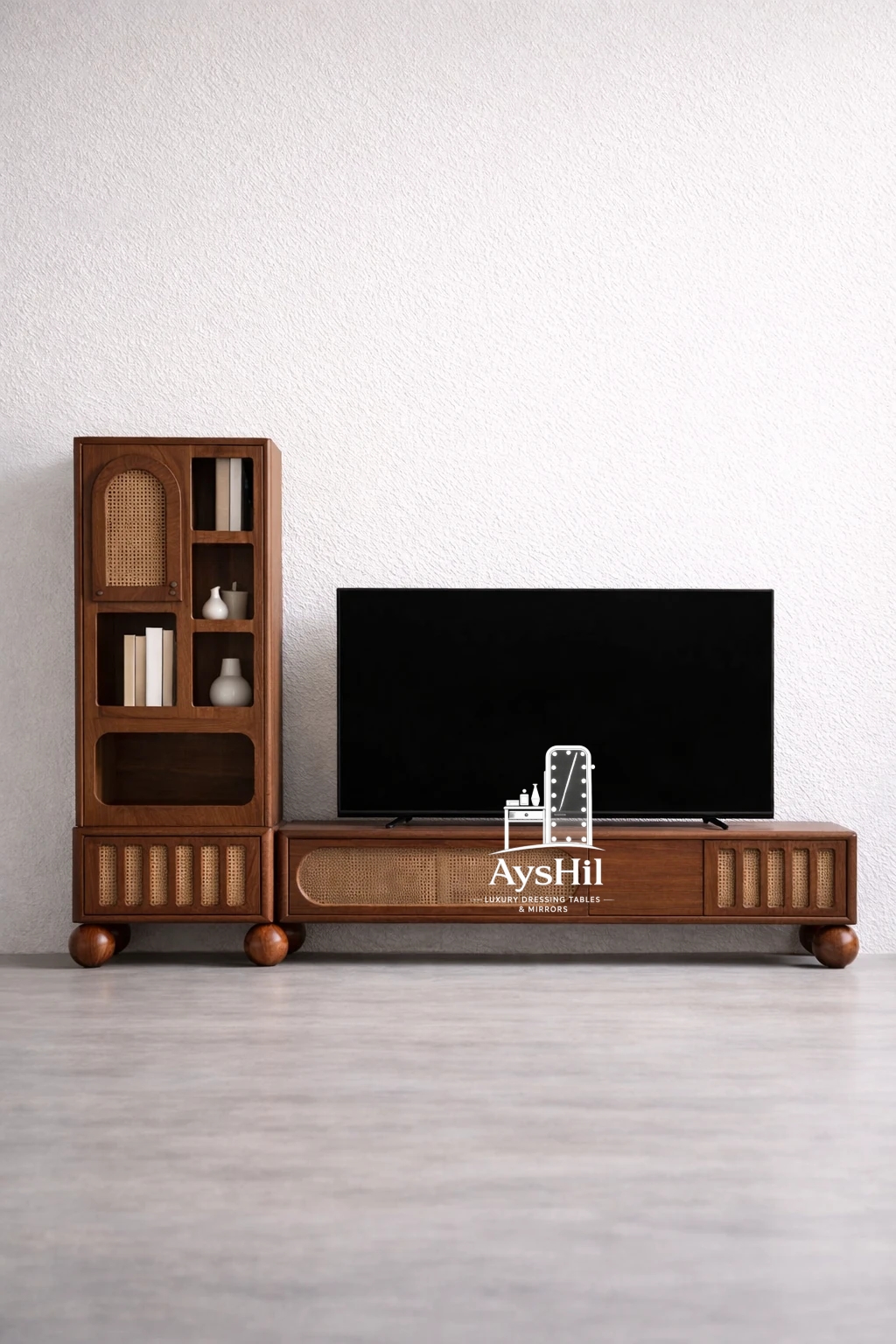 میز تلویزیون چوبی لوکس مدل وینرال | میز TV دو متری با ویترین و حصیر بامبو طبیعی