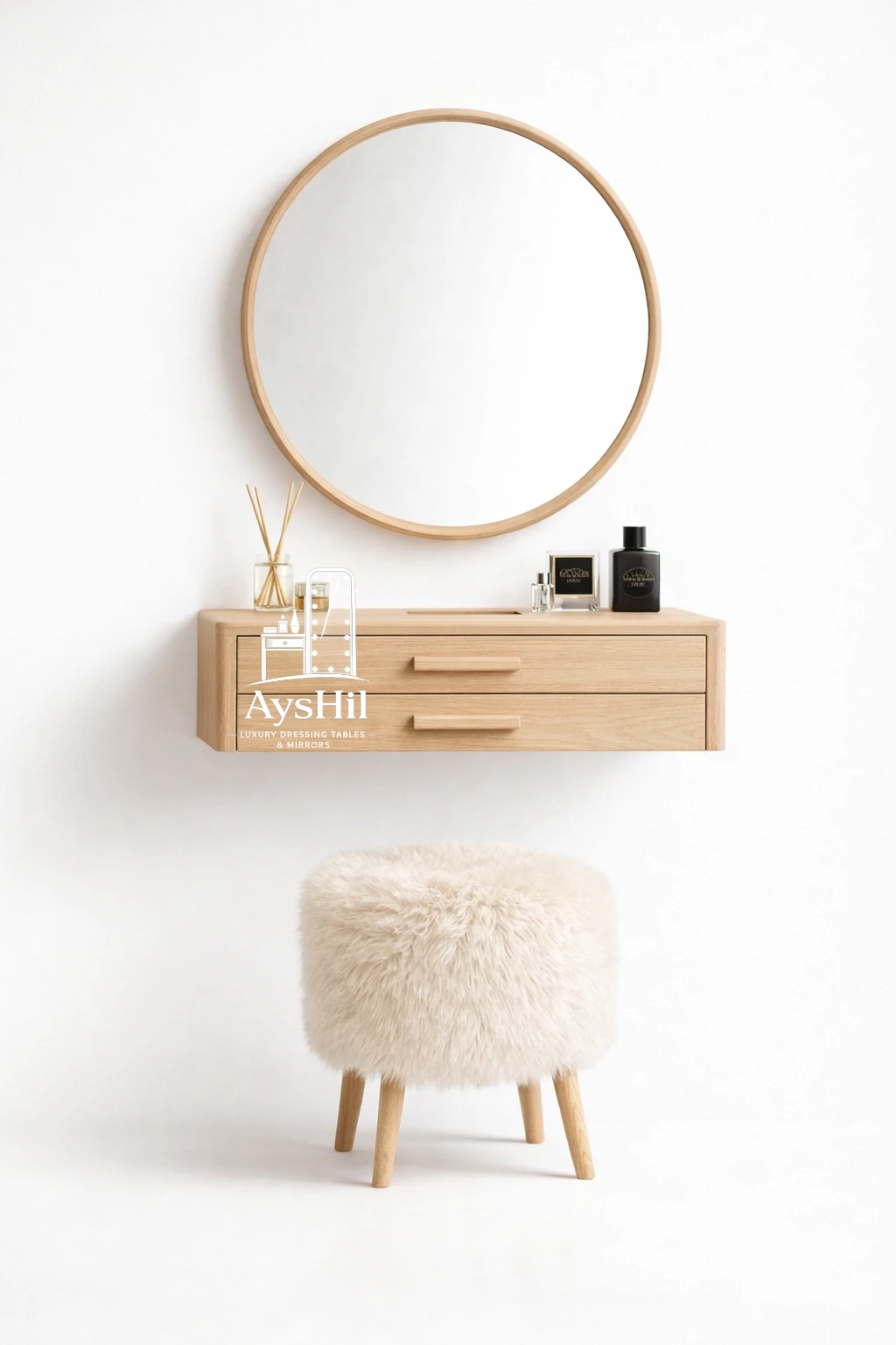 میز آرایش دیواری مهنتن آیشیل | ۲ کشو + آینه گرد ۶۰ + صندلی